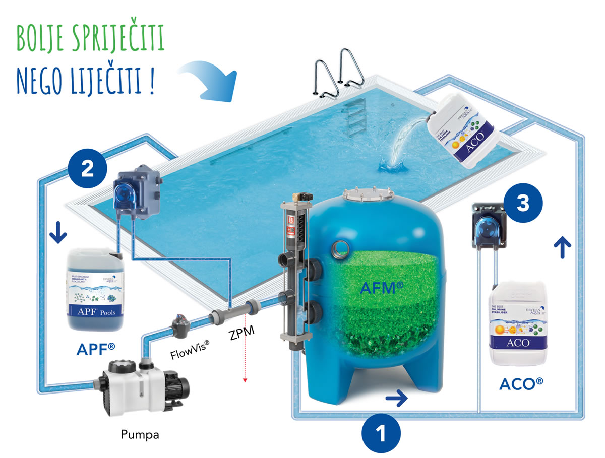 1. AFM® sprječava razvoj bakterija u filteru, 2. APF® sprječava razvoj algi i bakterija u bazenu na prirodan i održiv način, 3. ACO® filtrira sunčeve UV zrake i time smanjuje potrošnju klora
