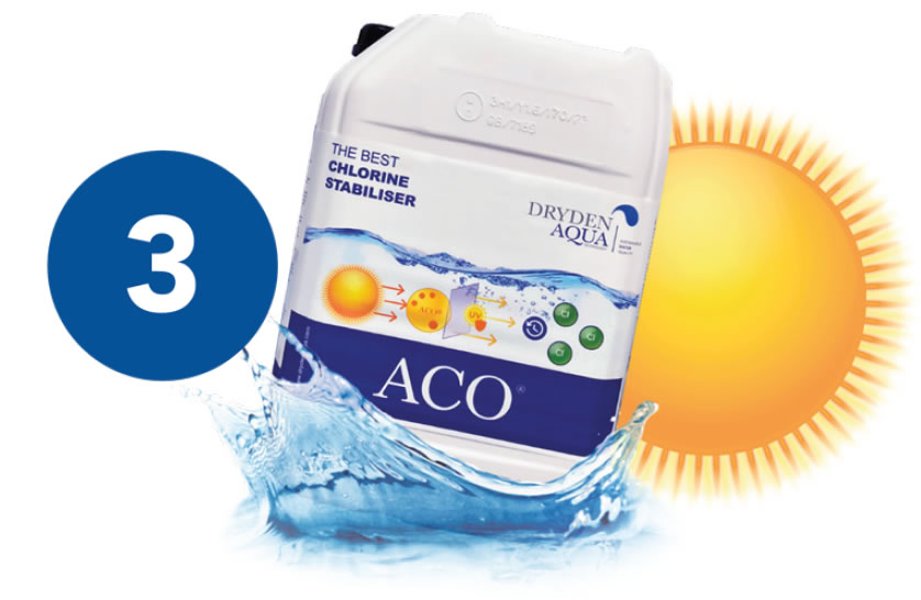 Treći korak uključuje ACO® - ekološki proizvod koji produljuje životni vijek klora 3 puta! Sunčeve UV zrake uništavaju klor i zbog toga se potrošnja klora u vanjskim bazenima preko ljeta drastično povećava. ACO® filtrira UV zrake i štiti klor od sunca čime značajno smanjuje potrošnju klora i povećava kvalitetu vode!