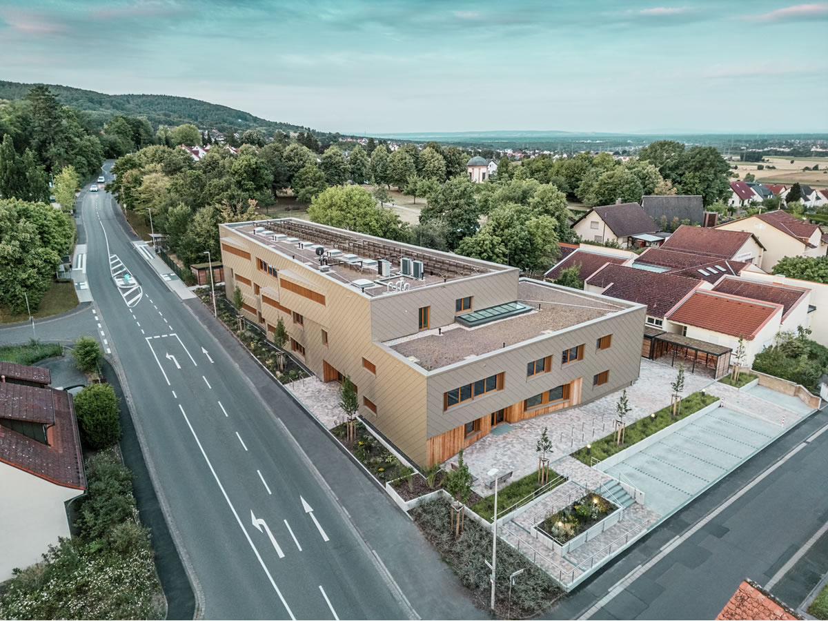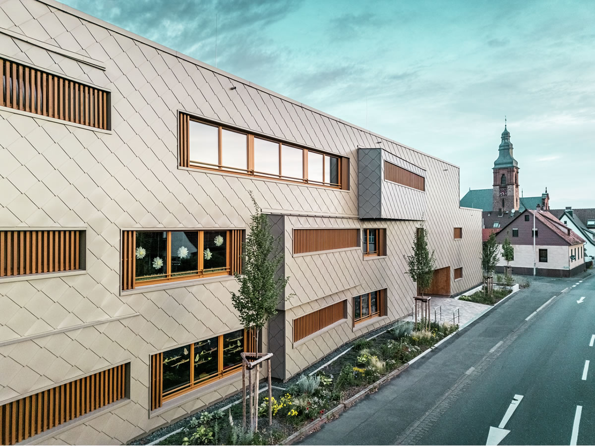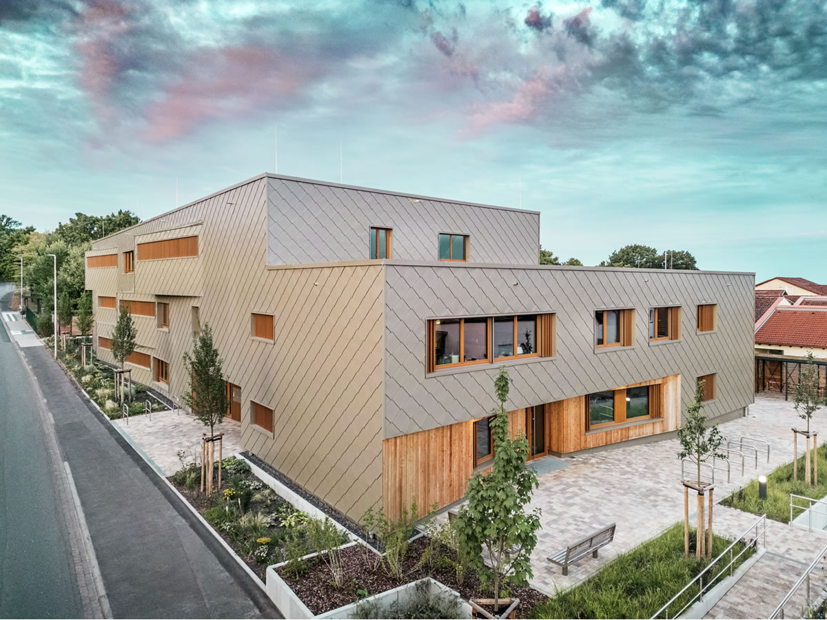 Brončanu aluminijsku „odoru“ oko zgrade postavila je limarska radionica ASA Schüßler. Ovo frankensko tradicijsko poduzeće uspješno je realiziralo već drugi PREFARENZEN projekt u Alzenauu. Za hibridnu zgradu montirano je oko 3.500 PREFA zidnih rombova 44 × 44 cm u brončanoj boji – svaki pojedinačno, skriveno, pomoću PREFA žlijebastih čavala na drvenu punu oplatu. Brojni kutovi zgrade i otvori obrađeni su džepnim profilima i standardnim kutnim elementima.