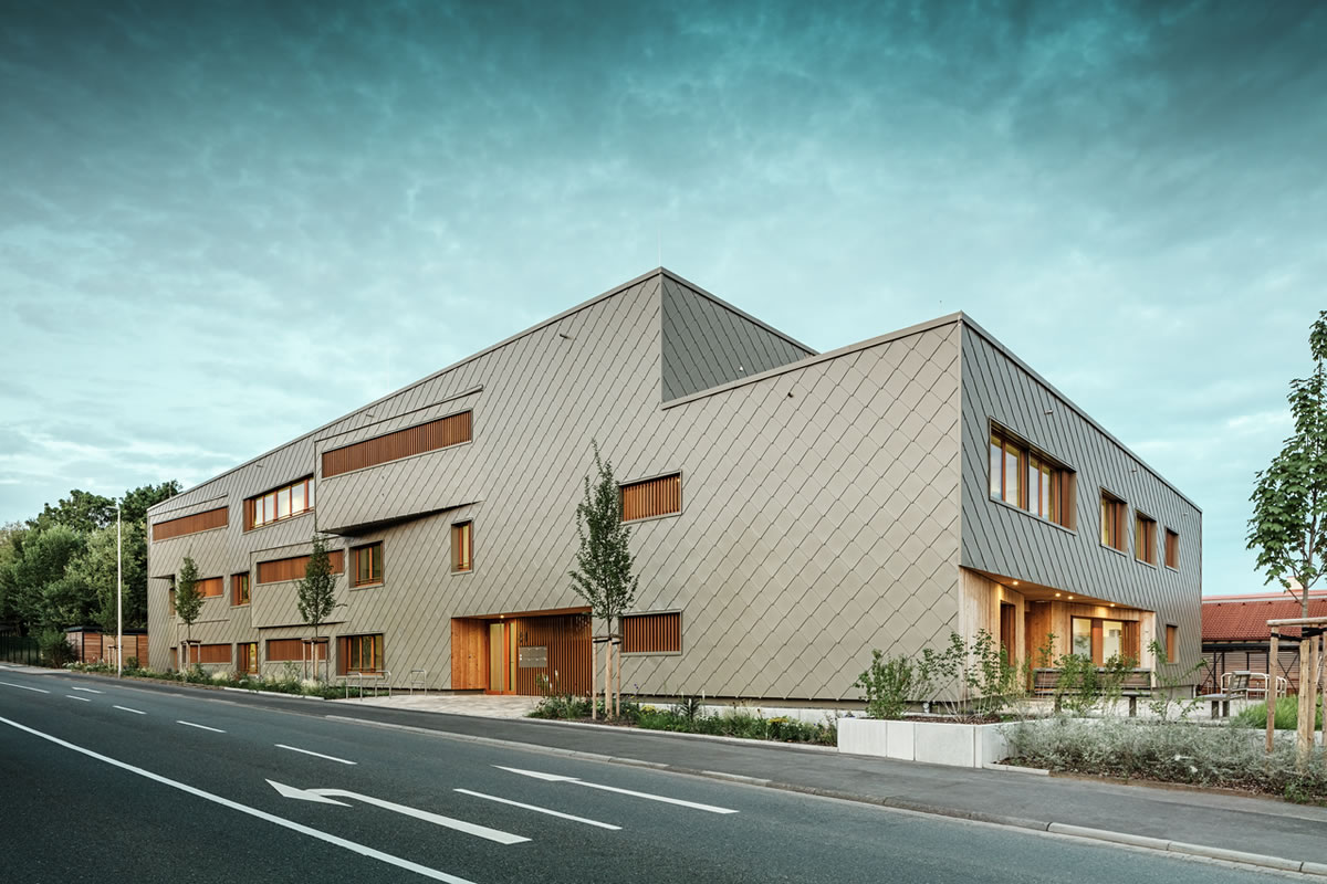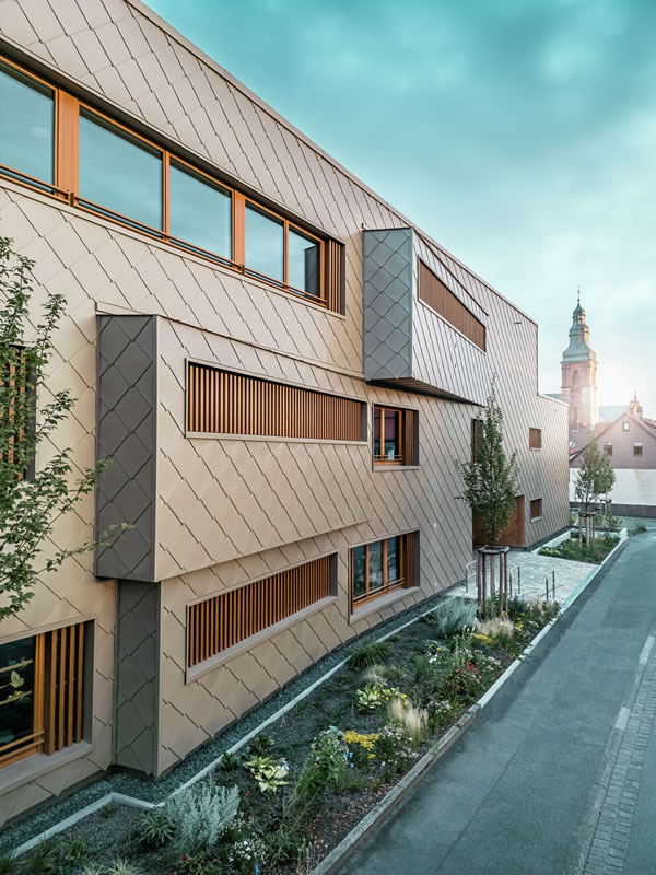 Izazov su predstavljale različite geometrije tlocrta i statičke mreže, raznoliki vodovi instalacija te prijenos opterećenja kroz donje etaže. Prednja aluminijska fasada od PREFA zidnih rombova 44 × 44 u brončanoj boji trebala je vizualno povezati različite funkcionalne dijelove hibridne zgrade u skladnu cjelinu. „Ako se promatra cijeli životni ciklus, PREFA je jednostavno vodeći po potrošnji energije i reciklabilnosti“, ističe Claudia Härtner, svjesna ekološke vrijednosti materijala koji štede resurse i djeluju klimatski aktivno, uvijek u kontekstu specifične lokacije primjene.
