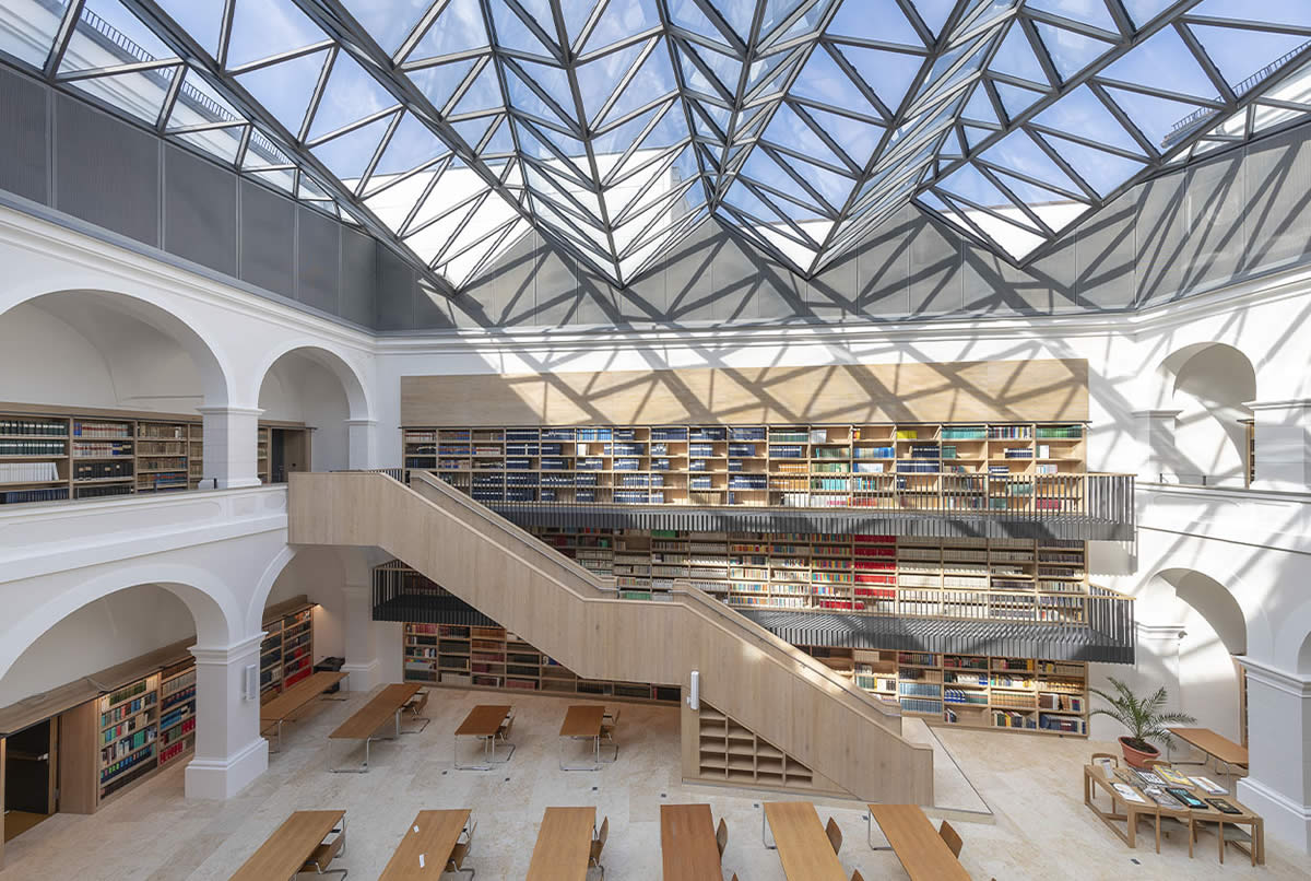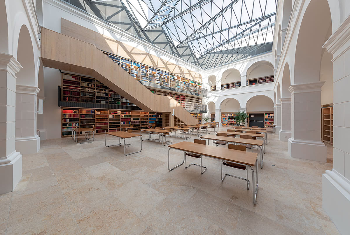 Državna knjižnica u Passauu u Njemačkoj prošla je kroz opsežan projekt obnove koja je trajala od 2014. do 2018. godine. Cilj je bio modernizacija njezine povijesne čitaonice koja je izvorno bila dio isusovačke gimnazije iz 17. stoljeća. Projekt je obuhvatio zamjenu staklene kupole inovativnom konstrukcijom krova od čelika i stakla te izvođenje novog poda od vapnenca lokalnog podrijetla. Sanacija, koja je naglasak stavila na održivost, uključivala je primjenu cjelovitog Mapei sustava za polaganje kamena.